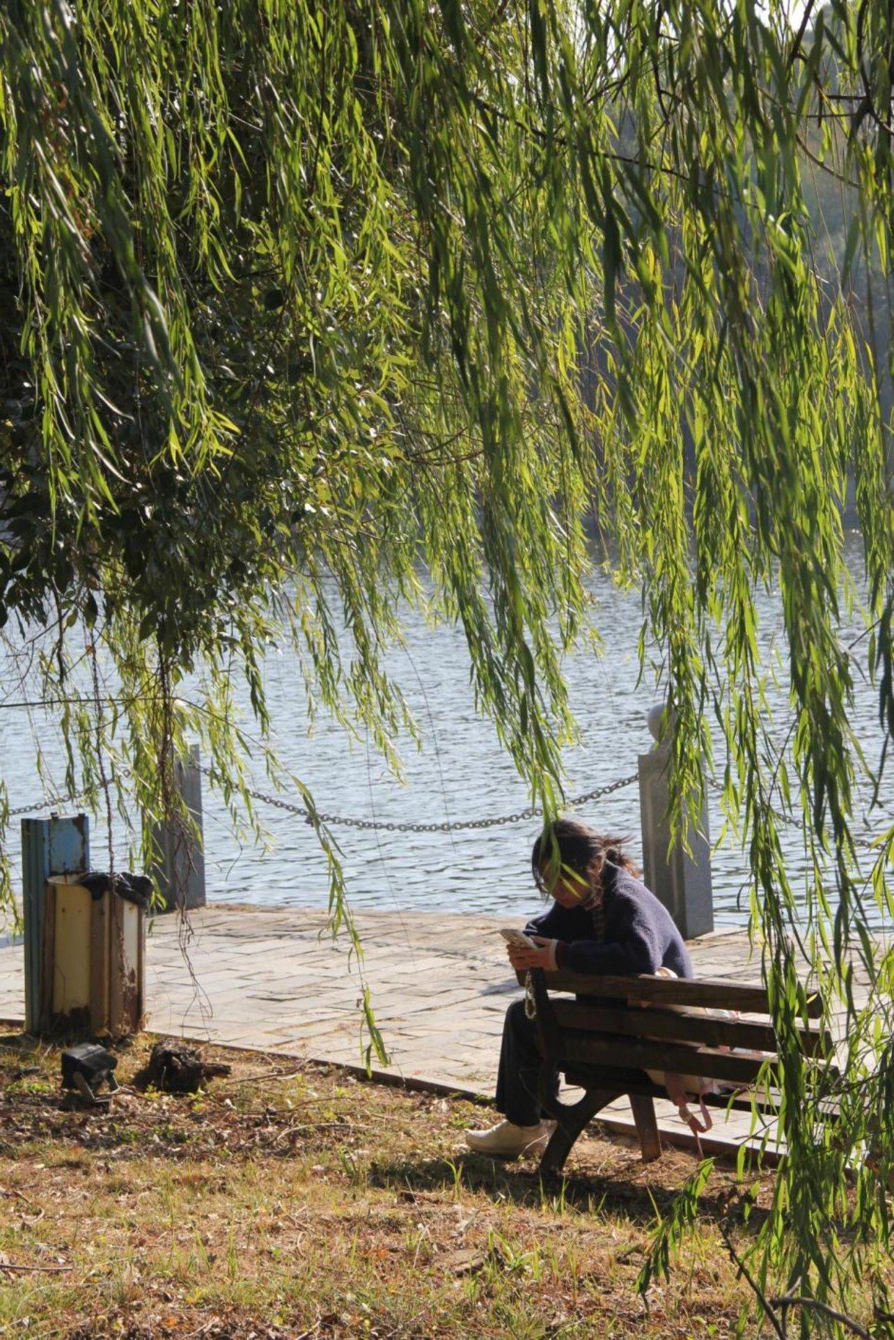 又一天,是多云。有人说,比起晴天,更喜欢多云的日子。过分张扬的阳光会在那时被云朵悄然过滤,温度恰到好处,空气温柔舒适。厚厚的云朵在天空慢慢地游动,摆着它最经典的造型轻轻地来、轻轻地去。如果说晴天的润溪湖似闪着光的镜,那多云天气的湖水便似一匹柔软的绸,宝蓝稳重、湖蓝松快、天蓝轻盈,大自然果然是最从容的调色师。此时沿湖边漫游,心中感到前所未有的平静。这是一个适合向内探索的天气,云也悠扬,风也悠扬,心灵在校园悠扬云层下也悄悄饱满起来。