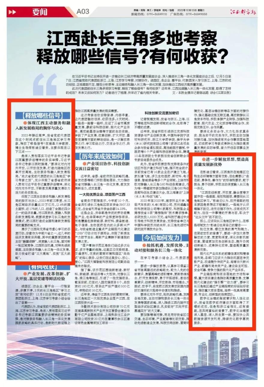 展示了江西向兄弟省市虚心学习的态度行动。安徽作为中部六省之一,这几年的经济发展有目共睹,其中的重要原因就是主动“融圈进群”,深度融入长三角。面对新一轮区域竞争,江西抓住机遇,对照先进找差距,主动服务和融入长三角一体化发展,助力我省打造“三大高地”、实施“五大战略”。
