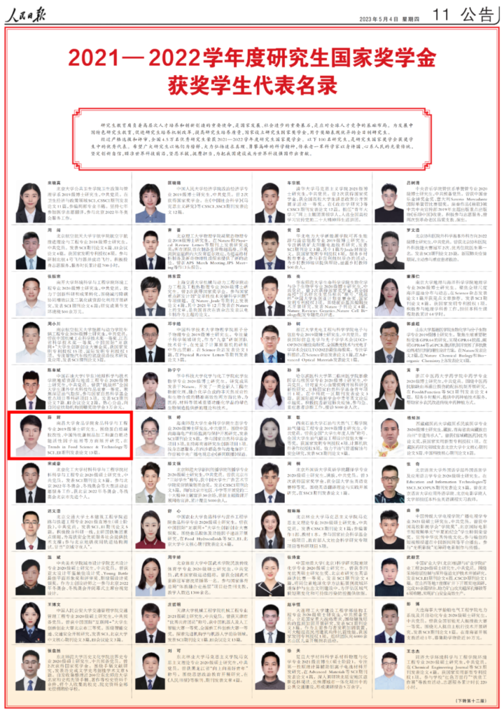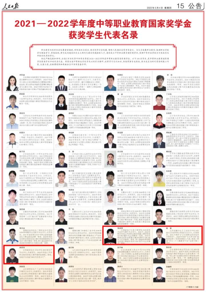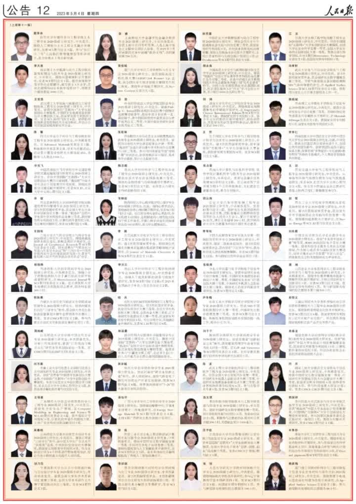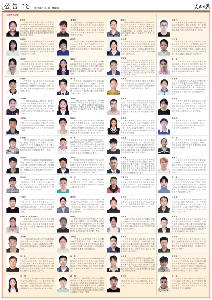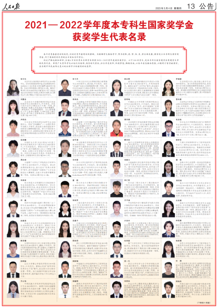 今天,人民日报用六个整版刊登了100名研究生国家奖学金获奖学生优秀代表、100名本专科生国家奖学金获奖学生优秀代表和100名中等职业教育国家奖学金获奖学生优秀代表名录。