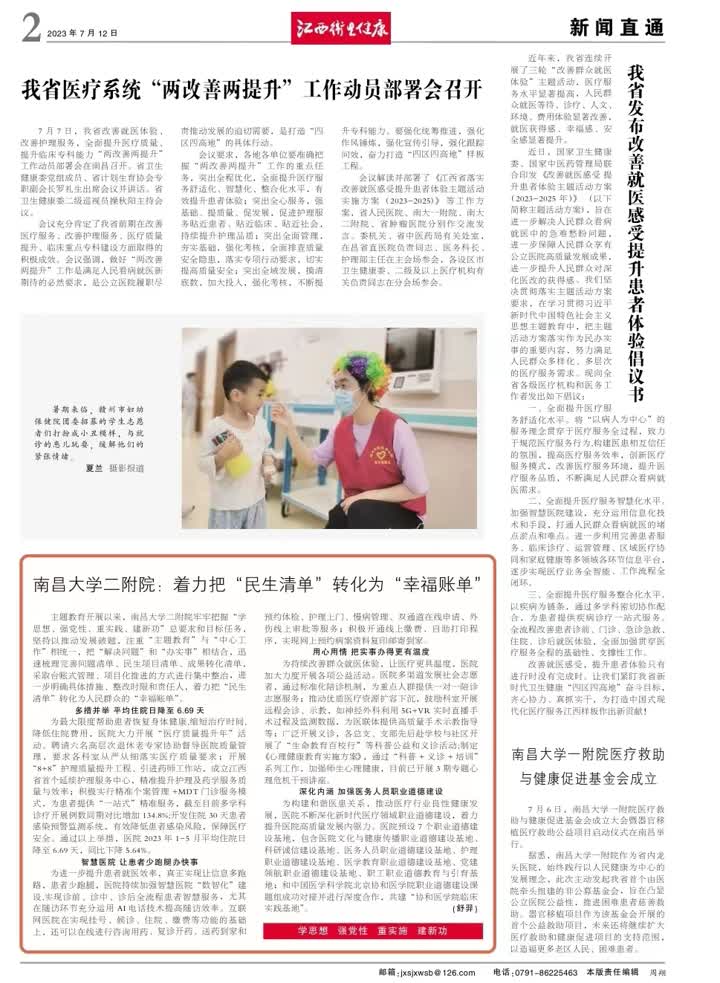 编者按:7月12日,《江西卫生健康》以“南昌大学二附院:着力把‘民生清单’转化为‘幸福账单’”为题刊发了南昌大学二附院牢牢把握“学思想、强党性、重实践、建新功”总要求和目标任务,着力把“民生清单”转化为人民群众的“幸福账单”的报道,具体内容如下: