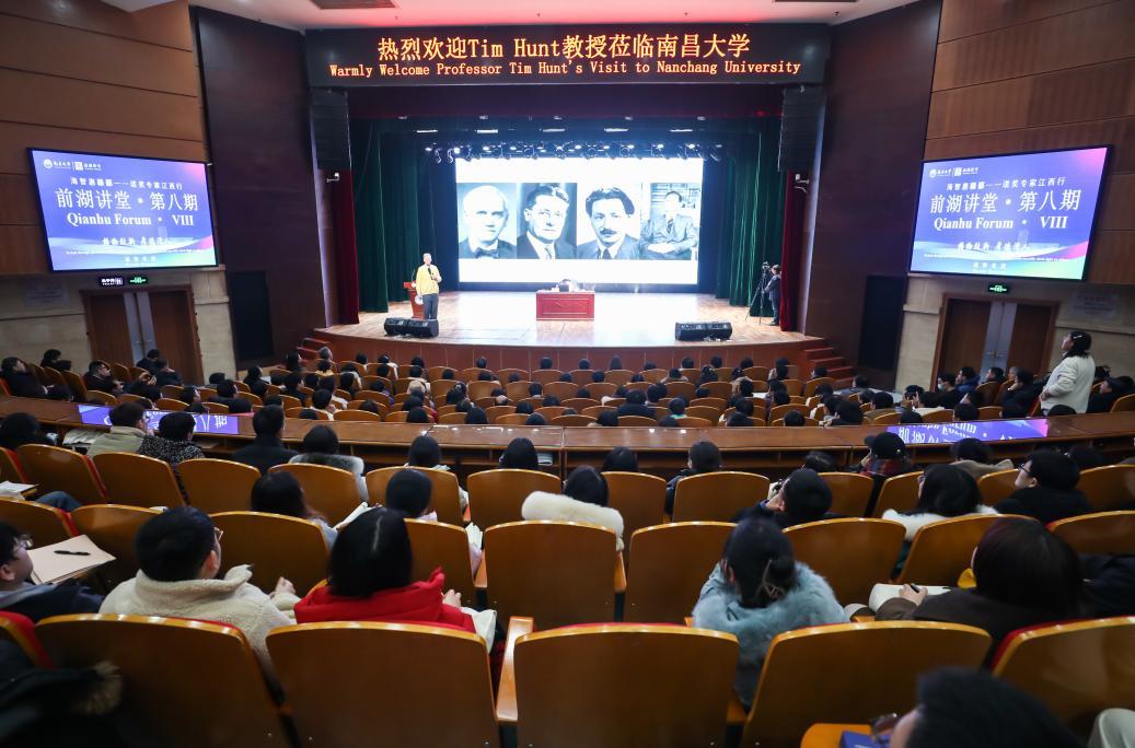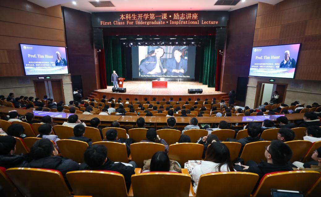 2月28日上午,Tim Hunt教授还为全校500名本科生代表作励志讲座。他以“How to Succeed in Science”为题,结合自身科研经历,为大学生现身说法、传经送宝,深刻阐述了成功科学发现的关键要素:追求真理和奉献精神、创新思维和科学知识。他勉励青年学子对科学要充满热情,保持求知欲和探索精神。要脚踏实地,不断努力,创新进取,勇于探索新知,敢于提出假设,不断发现科学问题,勇攀科学高峰。讲座结束后,Tim Hunt教授和同学们热情互动,认真回答同学们提出的问题。参加讲座的同学纷纷表示,通过听课,受益匪浅,将以教授为榜样,努力奋斗,不断探索未知,迎接未来的科学挑战。励志讲座由玛丽女王学院2019级学生王馨越主持,气氛活跃,Hunt教授对学生们的英语水平和思想深度印象深刻,高度评价了南昌大学的本科教育质量。