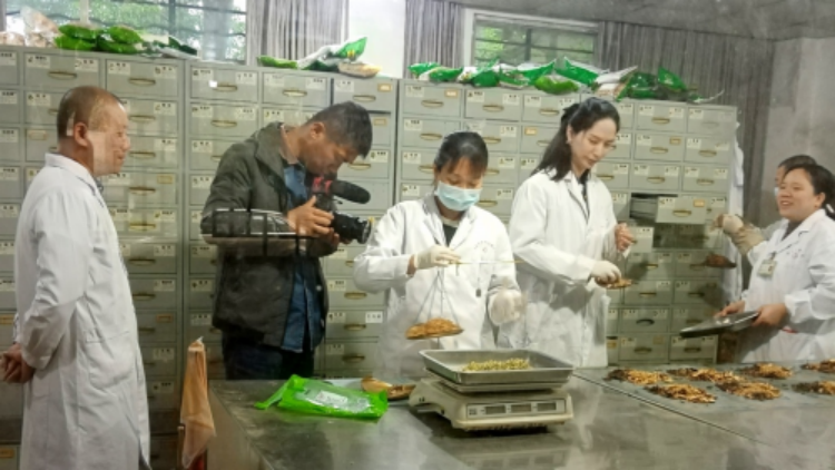 图为摄制组拍摄中医药材的抓取与配比