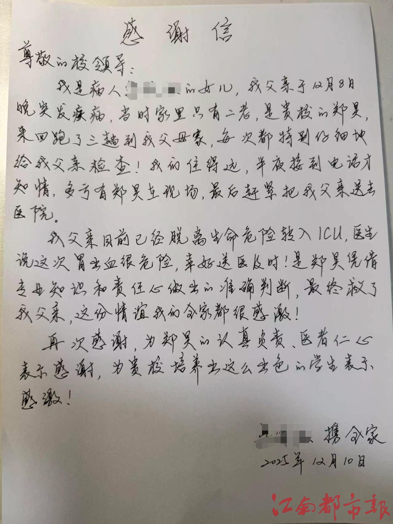 “医生说这次胃出血很危险,幸好送医及时!是郑昊凭借专业知识和责任心作出的准确判断,最终救了我父亲,这份恩情我的全家都很感激!”采访时,老人家属感动地说。老人家属还专门给郑昊写了一份感谢信,称赞他“认真负责,医者仁心”。对于自己3次登门的举动,郑昊诚恳地说:“这是出于医者初心,敬佑生命、救死扶伤是我的第一反应。”他还希望大家不要把自己捧得太高,“这本来就是正能量社会中的平常事,希望大家遇到类似事情也多一份善心”。