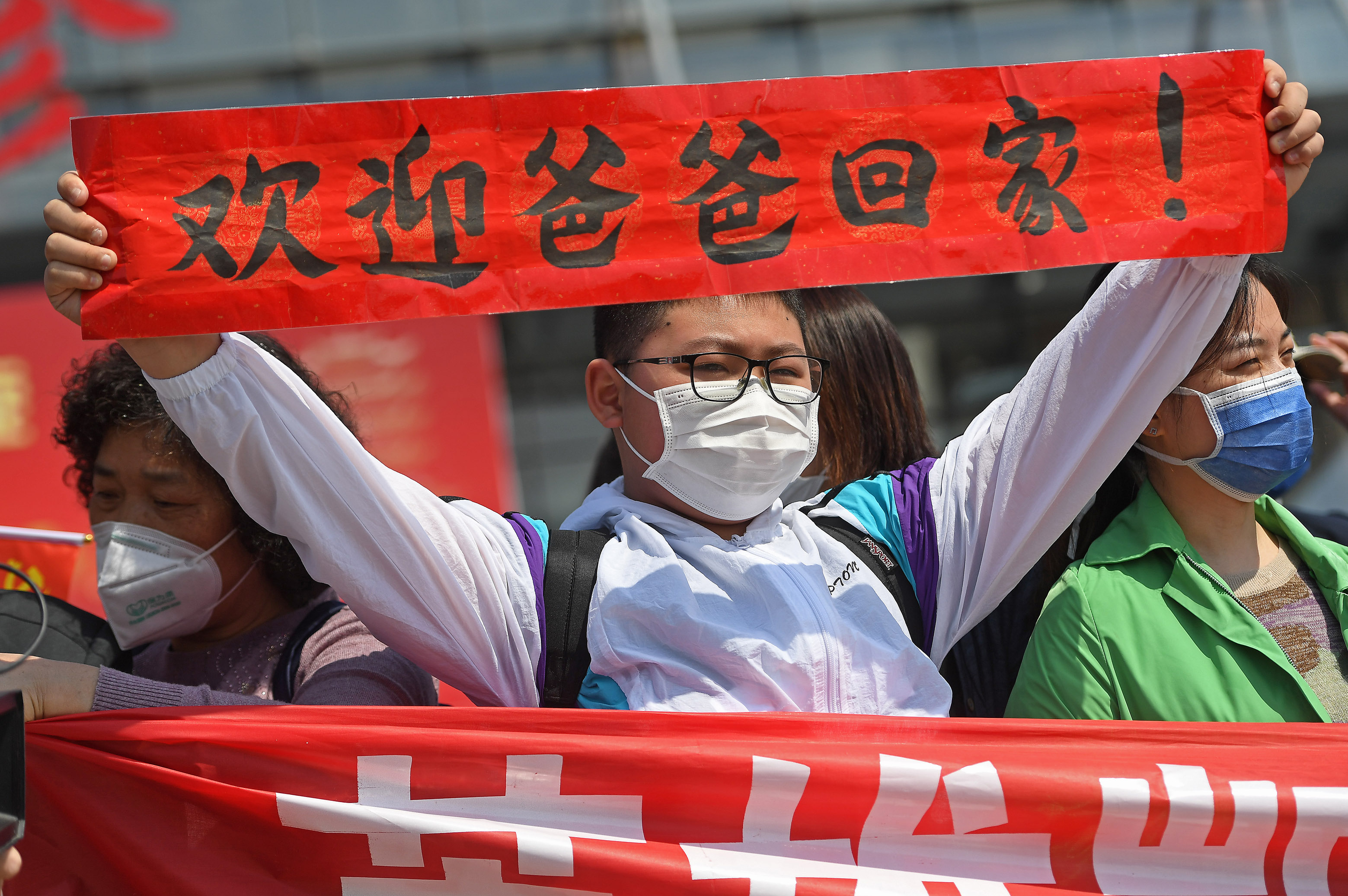 4月15日,在南昌大学一附院象湖院区,家属迎接医疗队员归来。