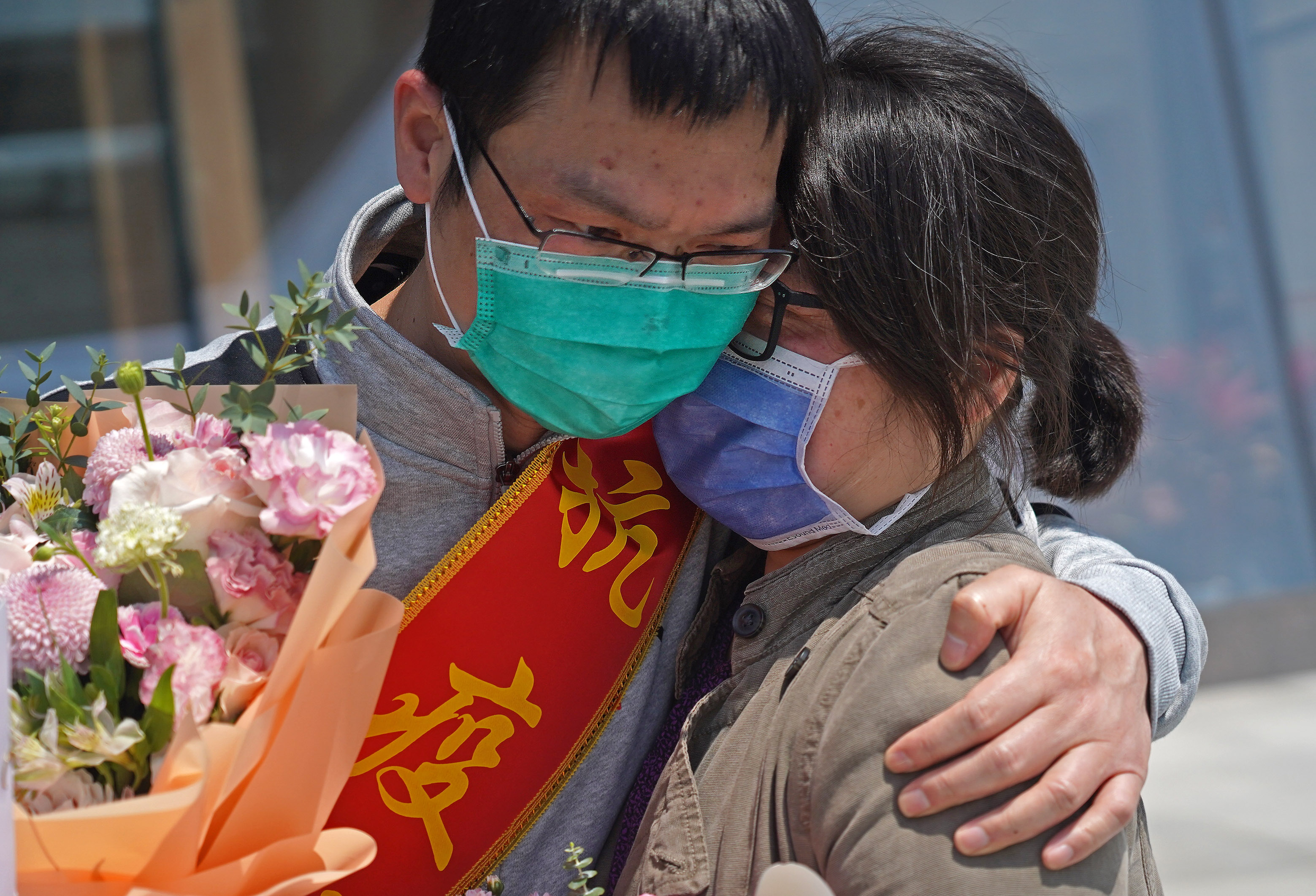 4月15日,在南昌大学一附院象湖院区,医疗队员曾振国(左)与爱人团聚。