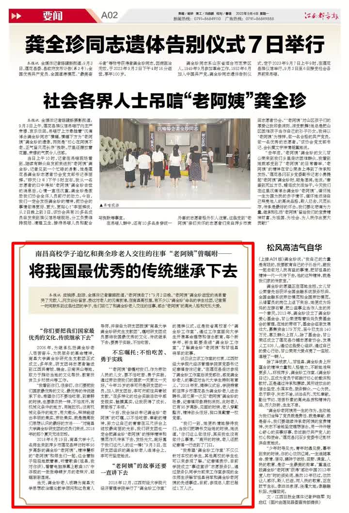 “老阿姨走了!”9月2日晚,“老阿姨”龚全珍逝世的消息看哭了无数人。网友纷纷留言,表达对老人的沉痛哀悼。在南昌高校里,有不少以“龚全珍”命名的学生社团,记者第一时间联系到这些社团的学子,他们回忆了和龚全珍老人交往的往事,感念“老阿姨”的高尚人格和无私大爱。