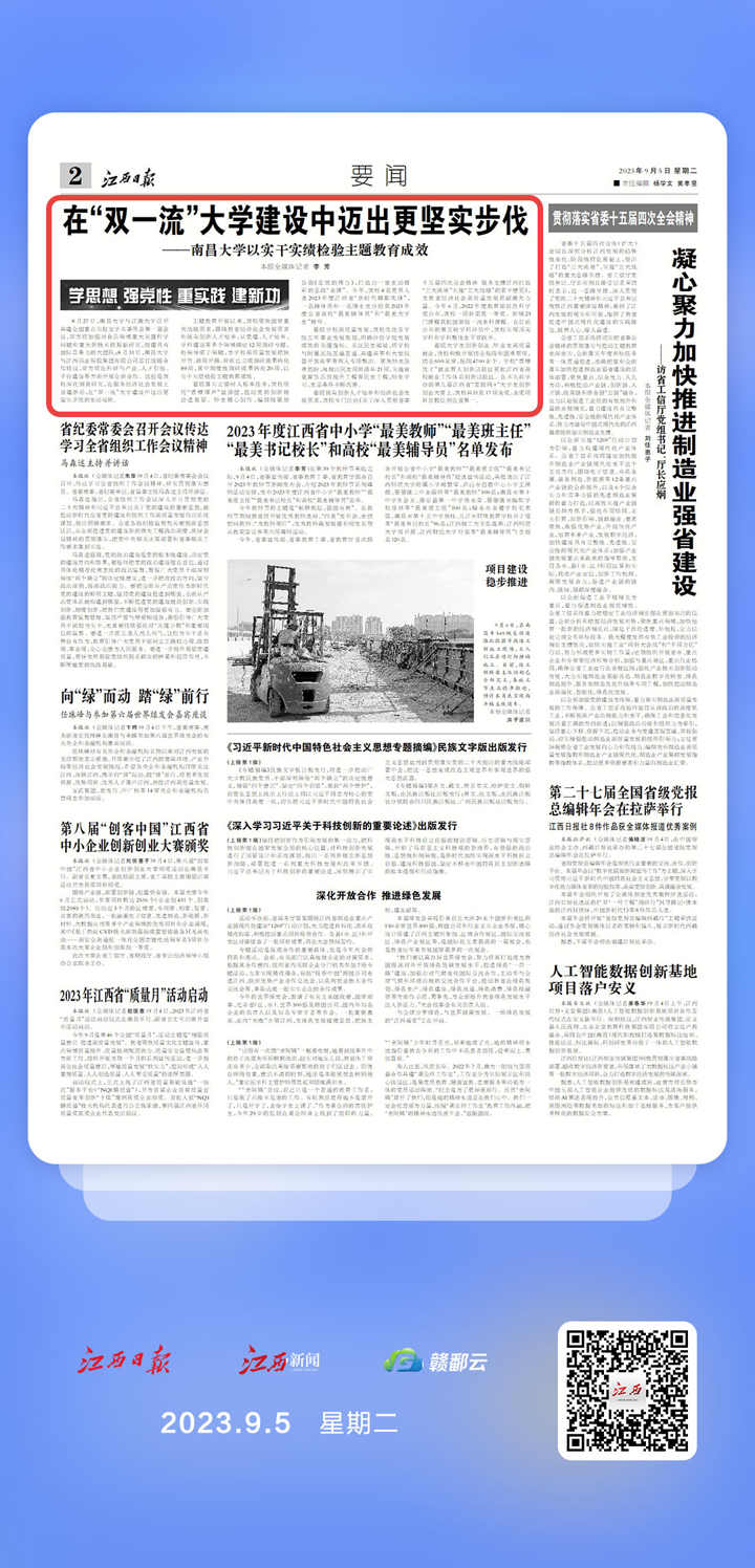 着眼拔尖创新人才培养和经济社会发展需求,该校专门出台《关于深入贯彻省委十五届四次全会精神 服务支撑江西打造“三大高地”实施“五大战略”的若干意见》,为我省经济社会高质量发展贡献南大力量。今年6月,2022年度教育部自然科学奖公布,该校一项目荣获一等奖。新增23门课程获批国家级一流本科课程。在日前公布的第五轮学科评估中,该校实现顶尖学科和学科整体水平双跃升。