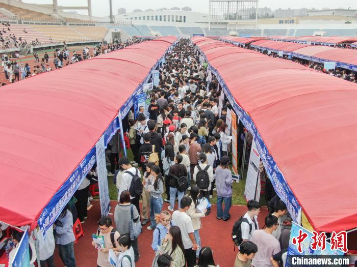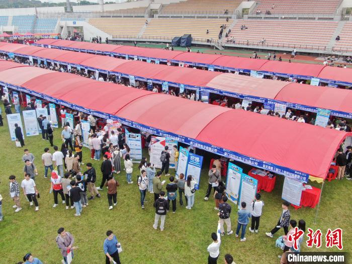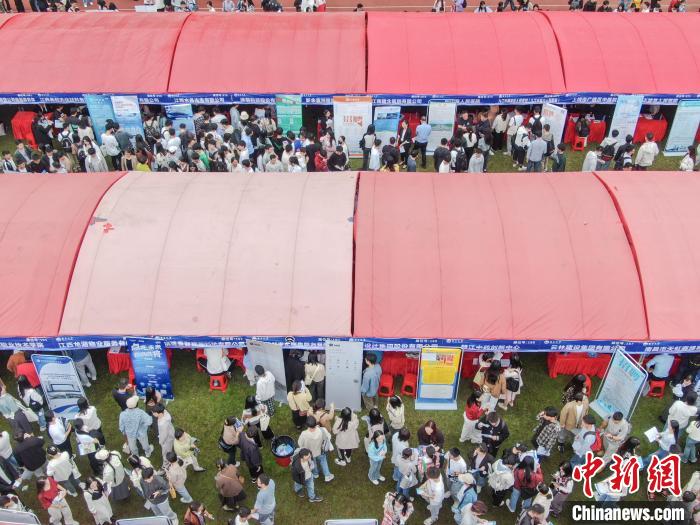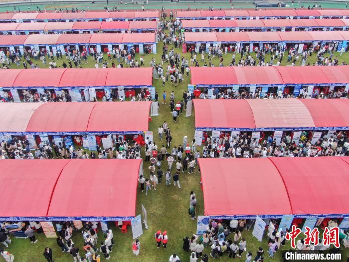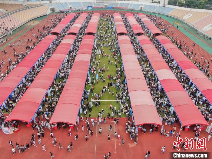 图为航拍双选会现场,众多毕业生在寻找工作机会。