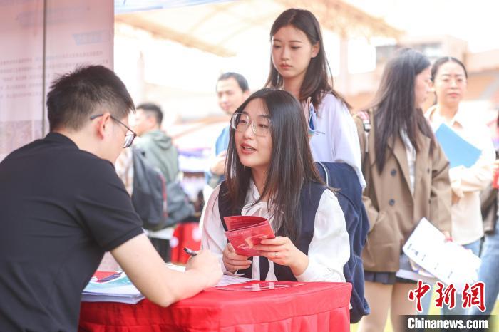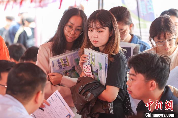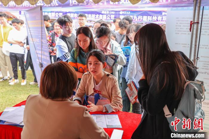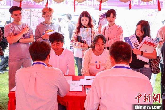 图为双选会现场,毕业生在同企业招聘人员交谈。