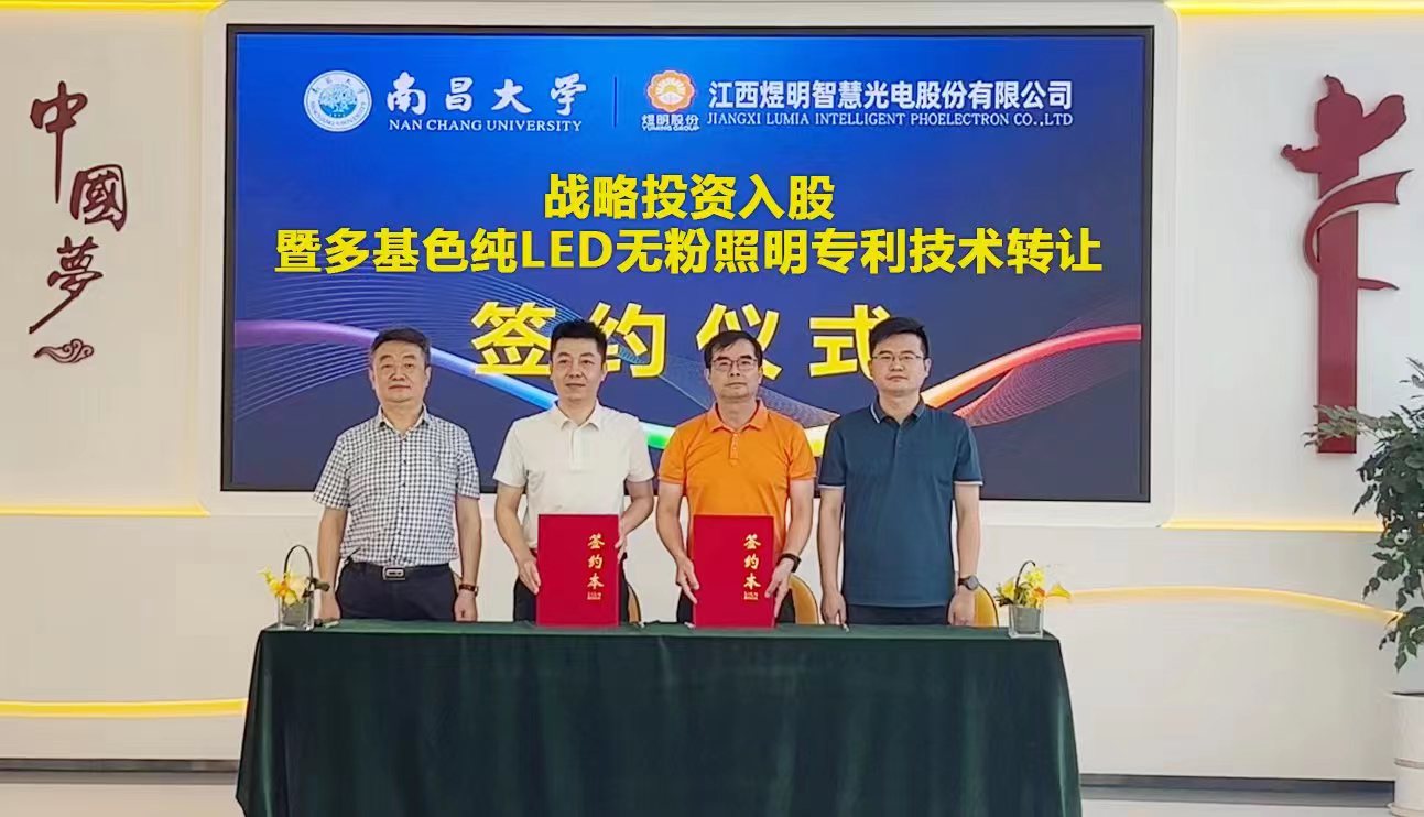 8月9日,南昌大学投资入股江西煜明智慧光电股份有限公司暨“多基色纯LED照明技术”专利转让签约仪式在江西省赣州市于都县江西煜明智慧光电股份有限公司举行。南昌大学技术转移中心、南昌大学资产经营有限公司、南昌大学国家硅基LED工程技术研究中心和江西煜明智慧光电股份有限公司的主要领导、授权代表出席签约仪式。此次签约,标志着“中国人首次发明的照明技术”在教育、家居等相关照明领域成功实现了成果转化,为千亿产值的教育照明市场提供智慧、健康的照明光源迈出了重要一步。