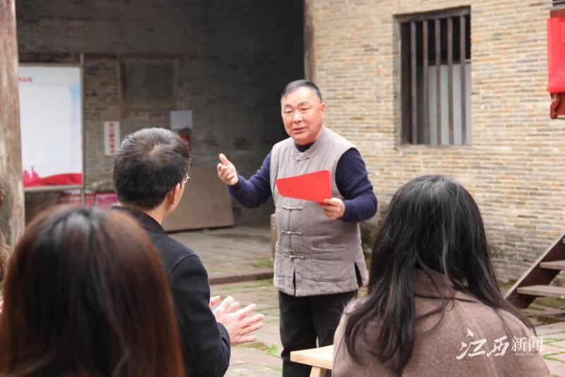 春风送暖万物新,在南昌市南昌县塘南镇令公庙,省青年讲师团成员与赣鄱乡村好青年们围坐在一起,在非遗传承人李寿印老师的带领下,打着拍子齐声合唱《塘南贺郎歌》,在文明新风尚带来的阵阵欢声笑语中,一场别开生面的“板凳”宣讲正在进行着。