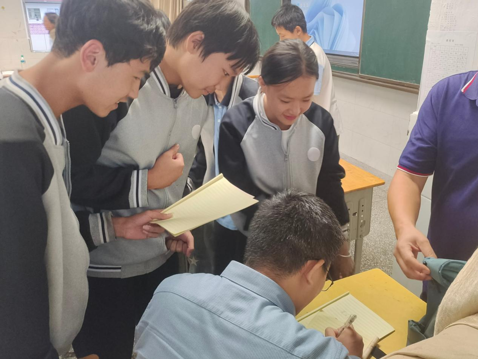 两位老师揭开了材料学和物理现象神秘的面纱,将科学的本质娓娓道来,极大地激发了同学们对科学的探索欲。讲座后,同学们带着本子兴奋地涌向两位老师,围成一圈,希望老师能在本子上签名。这份特殊的纪念品,象征着知识的传递,师生情的流动。