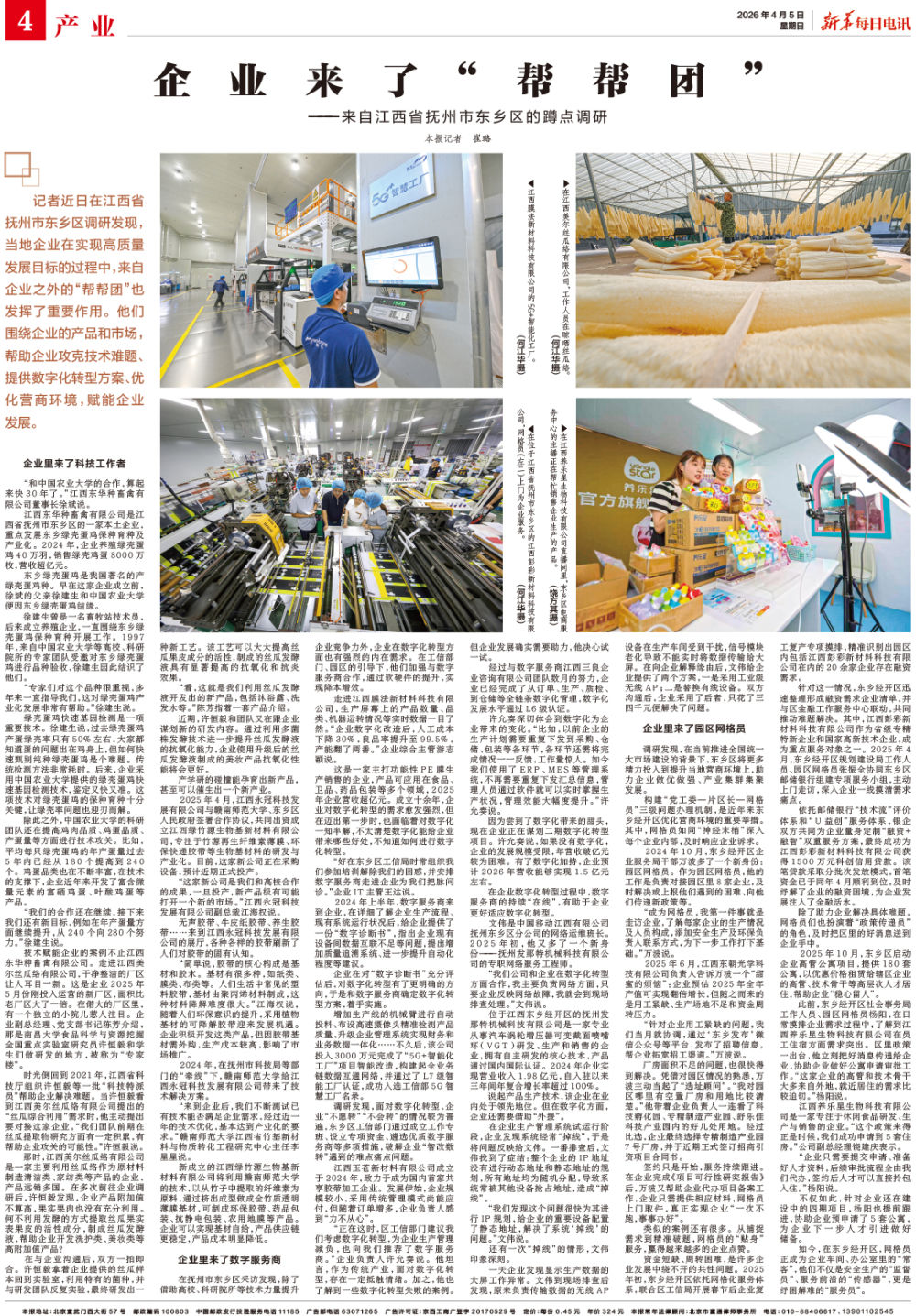 记者近日在江西省抚州市东乡区调研发现,当地企业在实现高质量发展目标的过程中,来自企业之外的“帮帮团”也发挥了重要作用。他们围绕企业的产品和市场,帮助企业攻克技术难题、提供数字化转型方案、优化营商环境,赋能企业发展。