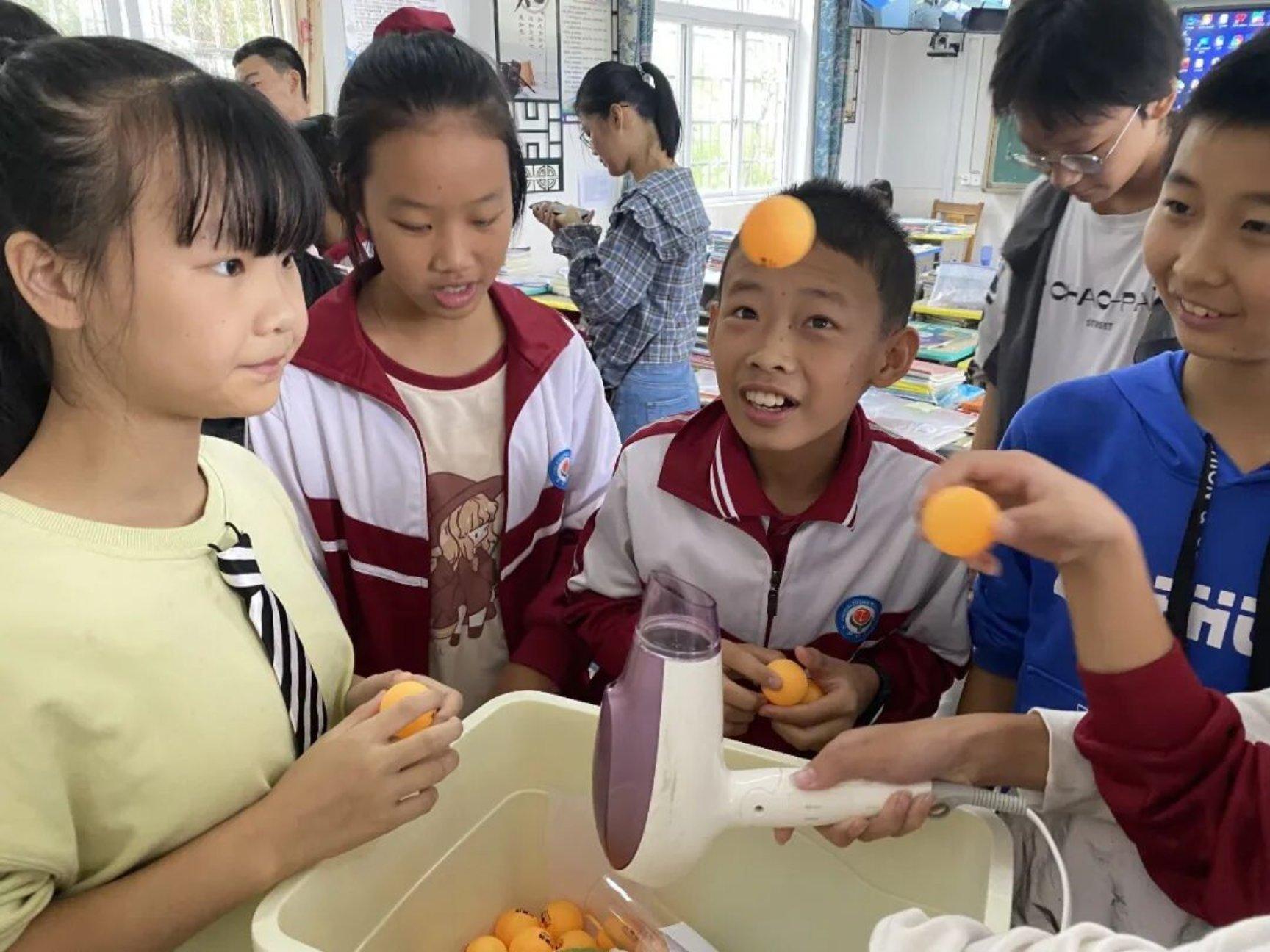 乡村学校学生用吹风机和乒乓球体验伯努利实验。