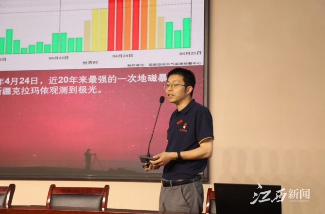 “太阳黑子的出现,会对地球产生强辐射,干扰通讯,地震随之增多……月球没有大气层,没有空气,没有风,也没有水……我们的征途是星辰大海……”。国家优秀青年基金获得者、江西省天文学会理事长、南昌大学周猛教授以《太阳、行星和深空探测》为题带领与会师生深入了解什么是空间科学、太阳和太阳系行星,并列举了世界各国深空探测和系外星系探测相关成果,勉励广大青少年关注空间科学、行星科学的发展,认真学习基础知识,练就过硬本领,为我国深空探测和航天事业贡献力量。