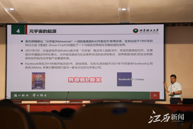 “未来元宇宙的三大特征是‘与现实世界平行’‘反作用于现实世界’‘多种高技术综合’,数字孪生广泛应用于航空航天、军事领域,并在‘元宇宙’赋能下,数字孪生领域的工具化、平台化发展越来越成熟……”。北京理工大学计算机学院王崇文教授以《从数字孪生到元宇宙》为题,揭示了数字孪生和元宇宙含义、原理及研究现状。通过列举智能制造、数字表演等应用项目实例,王教授鼓励与会学生注重基础积累、提升创新意识、训练系统思维,为日后深入学习研究奠定良好的数理基础和思维模式,为实现国家科技发展贡献力量,努力成为堪当民族复兴重任的时代新人。