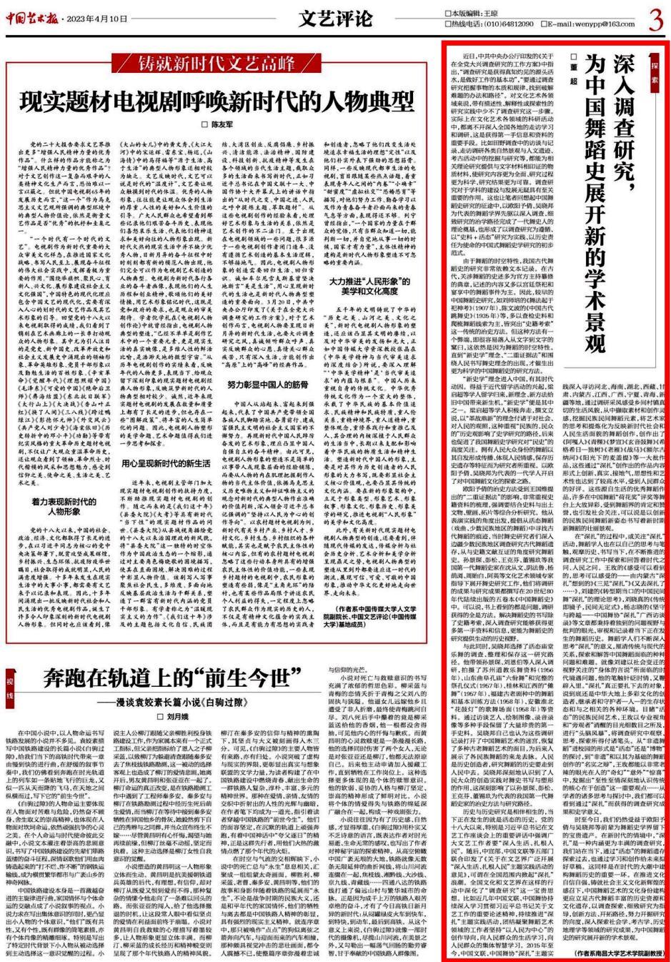 4月10日,《中国艺术报》“文艺评论版”发表了艺术学院舞蹈系董超副教授的署名文章《深入调查研究,为中国舞蹈史展开新的学术景观》。
