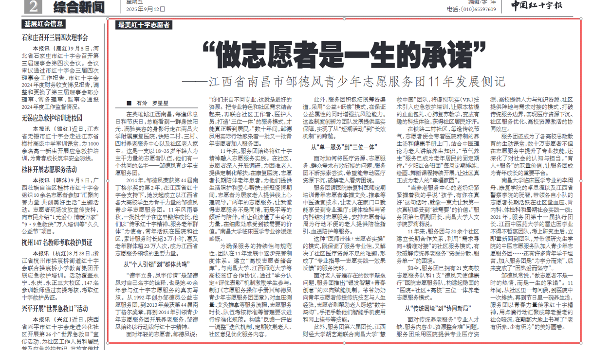 本网讯(中国红十字报)近日,《中国红十字报》以《“做志愿者是一生的承诺”——江西省南昌市邹德凤青少年志愿服务团11年发展侧记》为题,专题报道了我院邹德凤老师及其青少年志愿服务团长达十一年的感人事迹。现将原文转载如下。