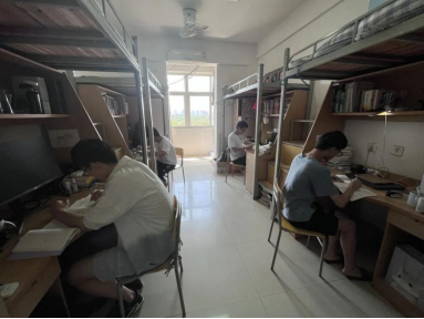由于疫情的反复,为了保障校园安全,学校内的图书馆和自习室等场所全部关闭,他们只能在寝室准备复试。居寝备考期间,大家互相帮助,相互鼓励。面对相似或一致的备考科目时,他们将全部学习资源共享,教材课本、网课视频、考试题目等等,都是他们共同的“武林秘籍”。同时他们还相互模拟问答和开展知识点抽背。夜晚睡觉前的寝室夜谈,既总结一日进展、明确计划,也卧谈畅聊,为新的一天加油鼓劲。
