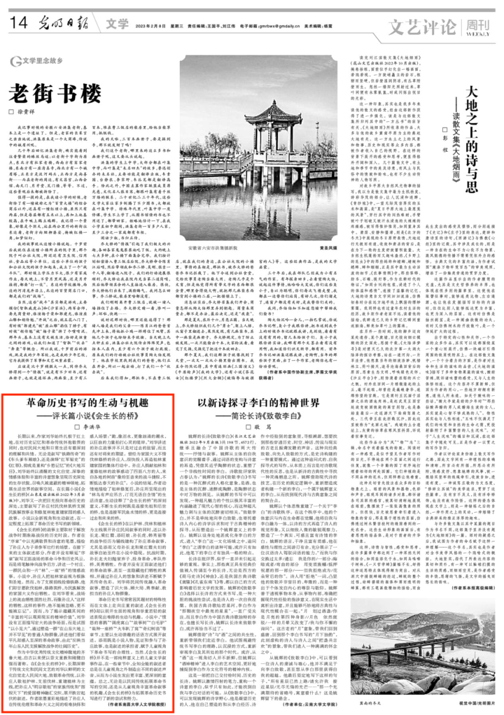 作为中华优秀传统文化精神腹地的齐鲁大地,自古以来便以崇文重教和刚健自强而著称。在《会生长的桥》中,长期深耕于传统文化和民间文艺的刘华以鲜明的文化自觉走入民间大地,致敬革命传统,以孙庄人敬祖护林、支前伐林、重建植林为主线,把孙庄人“明宗敬祖”的家族传统和“图报天下”的爱国精神融汇交织,展开跌宕起伏的叙述。作者浓墨重彩地描述了孙庄人在传统伦理和革命大义之间的艰难抉择和感人场景:“跪,像泪水,更像汹涌的潮水,以狂浪的力量拍打心灵的堤岸。”刘华讲述的孙庄故事并不只是对过去的驻留,而且还有对将来的期望。曾经为家国大义不惜伐林修桥的孙庄人,很快投入再造祖林重建家园的集体行动中。孙庄人捐献祖林和重修祖林的故事感动了四面八方的人,来自各地的树苗“像纷至沓来的战斗捷报,不断抵达春天的孙庄”。小说的结尾,作者动情地描绘了祖林修复后,孙庄所呈现出的“林鸟有声应吊古,汀花无语自含情”的生活诗意,生动诠释了“会生长的桥”的深刻意义,不断生长的树既是连接先祖和后世的桥,也是连接军民鱼水情的桥,更是连接过去和未来的桥。