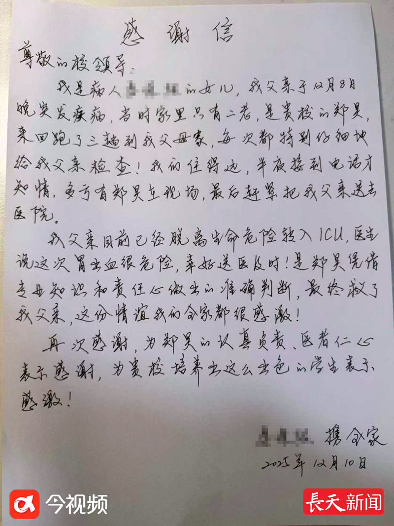 事后,家属感激不已,专程向学校送来感谢信,赞扬郑昊同学“认真负责、医者仁心,不仅是好邻居,更是生命的守护者”。南昌大学也给予了郑昊同学通报表扬,希望全校广大青年学子以该同学为榜样,将所学知识转化为服务会、守护他人的实际行动。