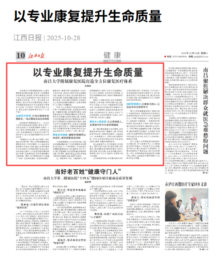 本网讯(附属康复医院)10月28日,《江西日报》专题报道了我校附属康复医院在康复医学领域的前沿探索与系统实践。作为一所集康复特色与综合学科于一体的高水平医院,我校附属康复医院始终坚持以患者为中心、以功能康复为目标,在意识障碍促醒、老年吞咽障碍干预、儿童发育康复、脊柱侧弯矫治等多个领域实现技术突破与服务创新,构建起覆盖全人群、全周期的康复医疗体系。以下是《江西日报》对我院康复医疗体系的详细报道。