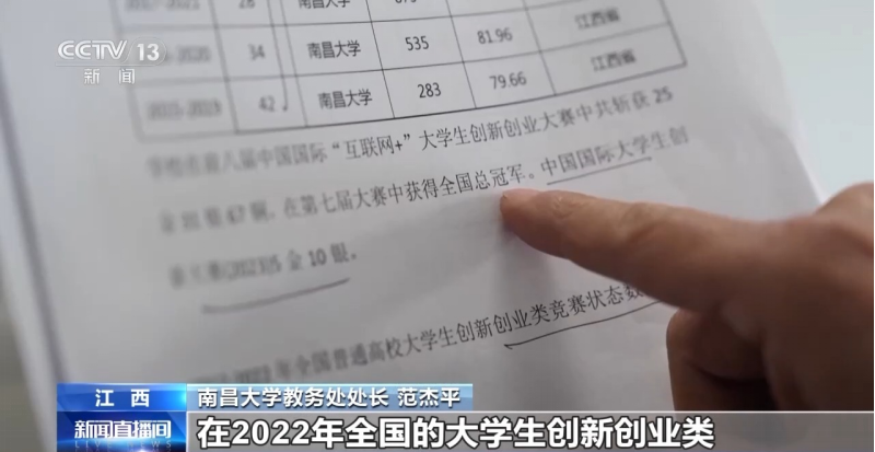 南昌大学教务处处长 范杰平:很多学生从原来仅仅关注学业成绩,还更关注创新创业能力,比如他可以从事一些论文,一些实验比赛,比如说全国普通高校大学生竞赛排行榜,在2019年的时候,我们排在42位,到2022年,到了22位,在2022年全国的大学生创新创业类竞赛状态数据排在第五名,对于南昌大学这种地方高校确实非常不容易的。