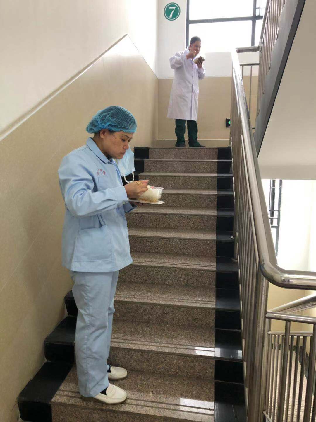 平常在家的时候,跟家人们三菜一汤,边吃边聊聊今天发生的新鲜事儿,也是一种放松。在曾都,为了降低交叉感染的风险,我们医务人员基本都是错峰吃饭,而且我们吃饭的时候都是相隔一两米,由于交班时间紧张,站在楼道吃饭也成为了“家常便饭”。