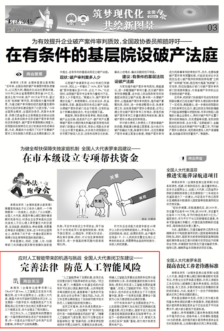 编者按:3月7日,法治新报以“应对人工智能带来的机遇与挑战 全国人大代表闵卫东建议一完善法律 防范人工智能风险”为题报道全国人大代表、南昌大学元宇宙研究院院长闵卫东,从发展新一代数字技术、构建新质生产力发展格局以及支持欠发达地区发展未来产业三个维度出发,向大会提出相关建议。具体内容如下: