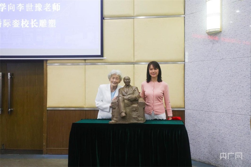 现场,还举行了潘际銮院士雕像赠送仪式,罗嗣海与雕像的主要创作者、建筑设计学院杜小林老师代表学校向潘老家属李世豫女士、潘瑩女士赠送雕像。