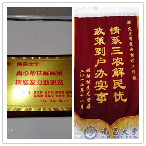 贫困户代表向学校驻村工作组赠送的牌匾和锦旗,表达感激之情