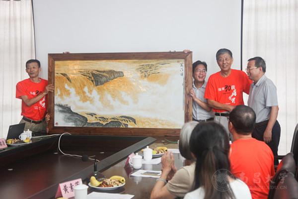 班长程志刚介绍了班级当时的毕业情况并代表全体同学们表达了对母校的感激之情,母系老师也和同学们讲述了当年那段共同的记忆,同学们一同分享了当时在江西大学时求学时的回忆。三十年来,同窗情谊一直如初。随后,班长和瓷画大师徐会全校友代表全班同学向母校捐赠自己所作瓷画《黄河颂》一幅。