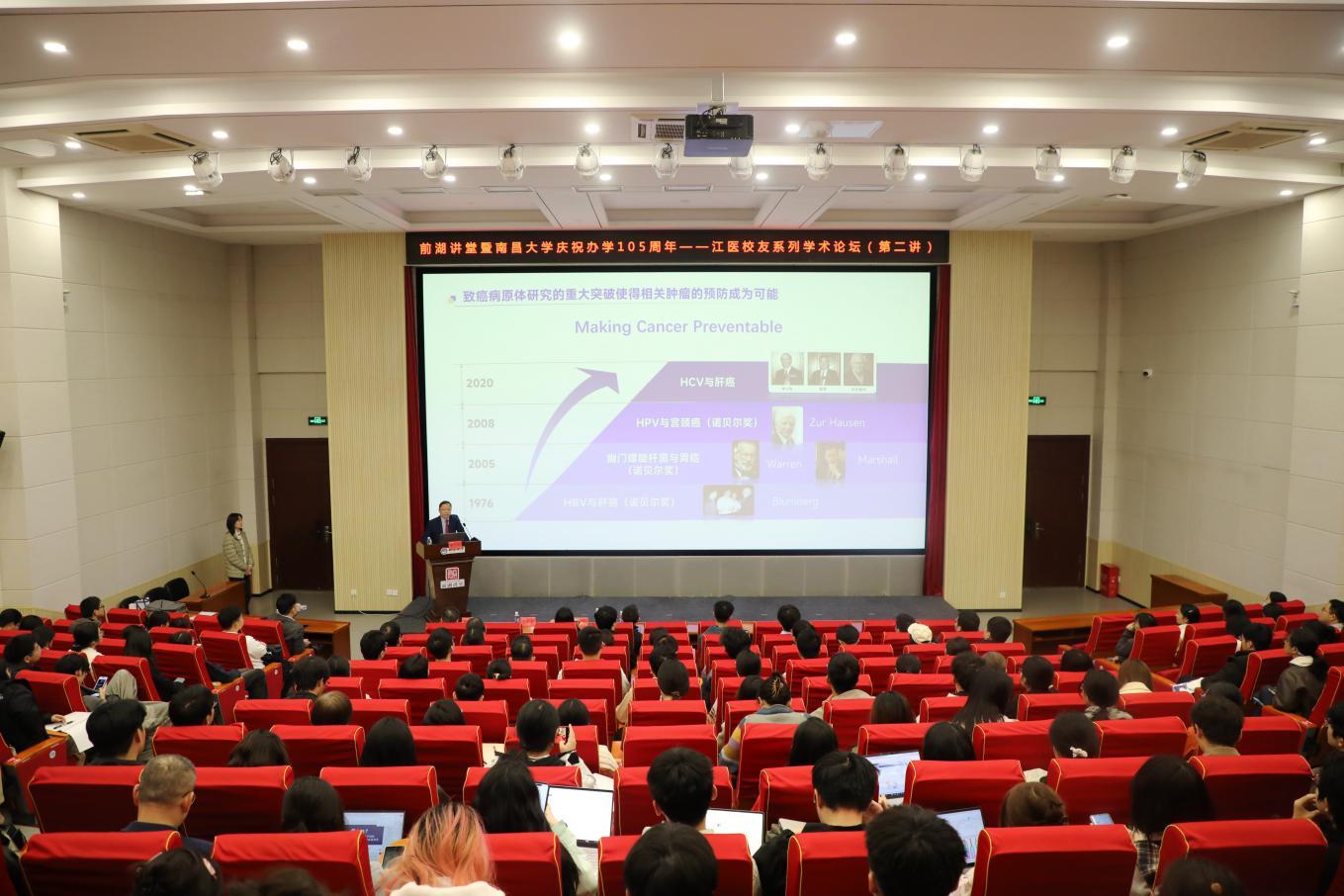 在第二附属医院红角洲院区,曾木圣院士进行了实地调研,随后做客学校“前湖讲堂”暨“南昌大学庆祝办学105周年——江医校友系列学术论坛”(第二讲)。他以《EB病毒疫苗分子基础与研发策略》为题,系统阐述了相关领域的前沿动态与科研路径,为在场师生带来深刻启迪。