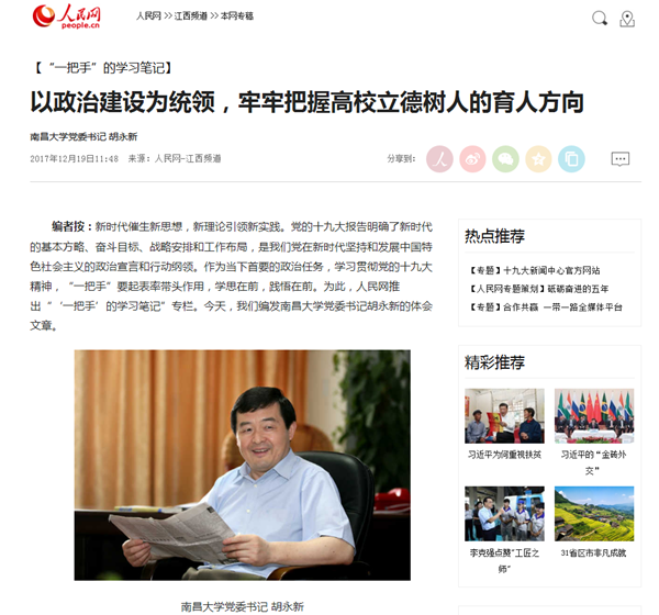 本网讯(南轩)12月19日,人民网在“‘一把手’的学习笔记”专栏推出校党委书记胡永新学习贯彻十九大精神体会文章《以政治建设为统领,牢牢把握高校立德树人的育人方向》,全文如下:
