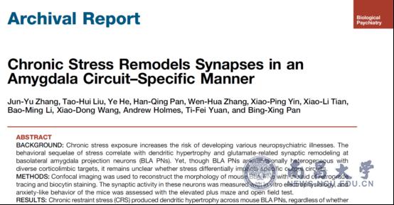本网讯(生命科学研究院)日前,神经精神科学领域国际学术刊物《生物精神病学》(Biological Psychiatry)在线发表了我校生命科学研究院潘秉兴教授团队关于慢性应激引发焦虑障碍的脑机制的研究论文。这是潘秉兴教授团队2017年以来再度在《生物精神病学》发表的科研成果。