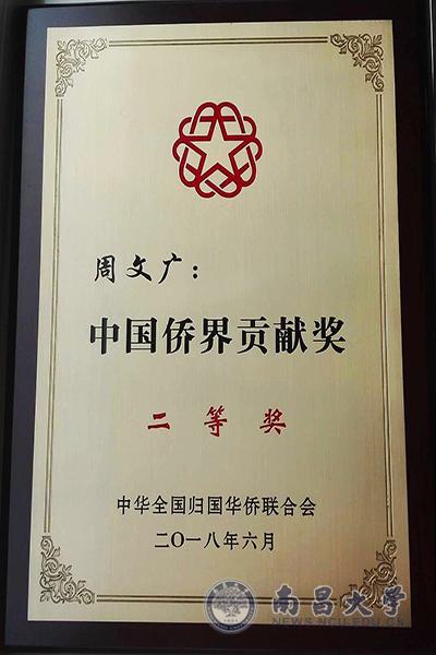 “中国侨界贡献奖”由中国侨联于2003年设立,是由中国侨联邀请相关领域院士和知名专家组成评审团评定的全国性奖项,每两年举办一次,已连续评选七届。设立的目的在于展示和表彰新侨回国后的创新创业成果,以吸引更多的海外侨界高层次人才以多种形式为国服务。设立以来,先后奖励过黄大年等一批侨界创新创业杰出人才。本次评选对象突出侨界高端人才,重点是近两年来在科学研究、技术研发、科技成果转化或其他创新创业领域取得重要成果和作出突出贡献的新侨。