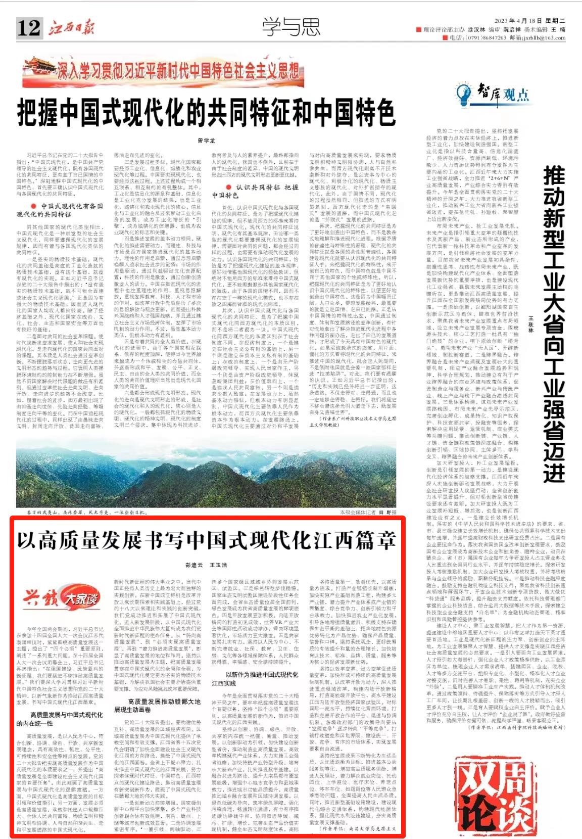 编者按:4月18日,《江西日报》理论版“深入学习贯彻习近平新时代中国特色社会主义思想”专栏以《以高质量发展书写中国式现代化江西篇章》为题,刊发我校彭迪云教授与马克思主义学院博士生王玉洁合作撰写的学习党的二十大精神与全国两会精神体会文章,内容如下: