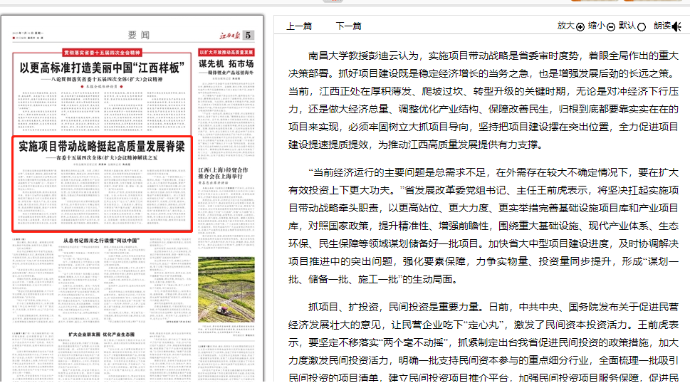 编者按:7月31日,《江西日报》以《实施项目带动战略挺起高质量发展脊梁——省委十五届四次全体(扩大)会议精神解读之五》为题刊发报道,其中采访我校彭迪云教授关于实施项目带动战略挺起高质量发展脊梁的解读,内容如下: