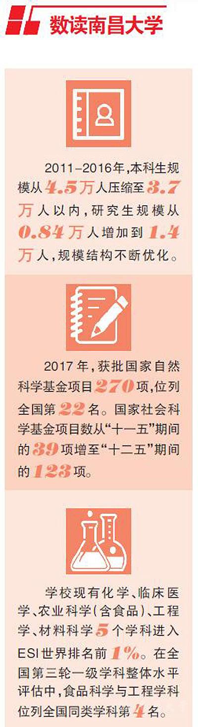 在国家启动高等教育“双一流”战略的重大机遇面前,南昌大学提出“育人为本,创新驱动,实干兴校,拼争一流”的工作方针,并及时制定《南昌大学建设高水平大学实施方案》,明确要努力建设一流学科、一流专业、一流平台,提供一流服务。