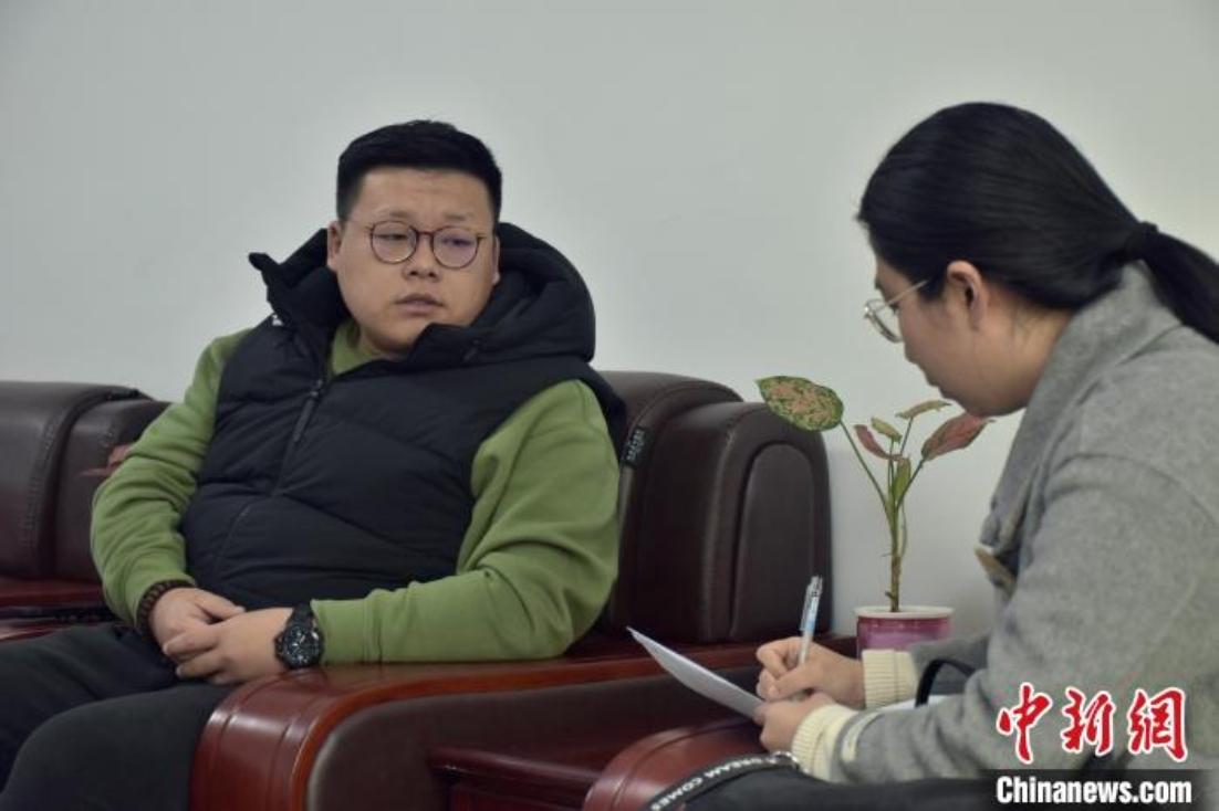 图为南昌大学共青城光氢储技术研究院办公室主任张皓然(左一)接受记者采访。巫发阳 摄