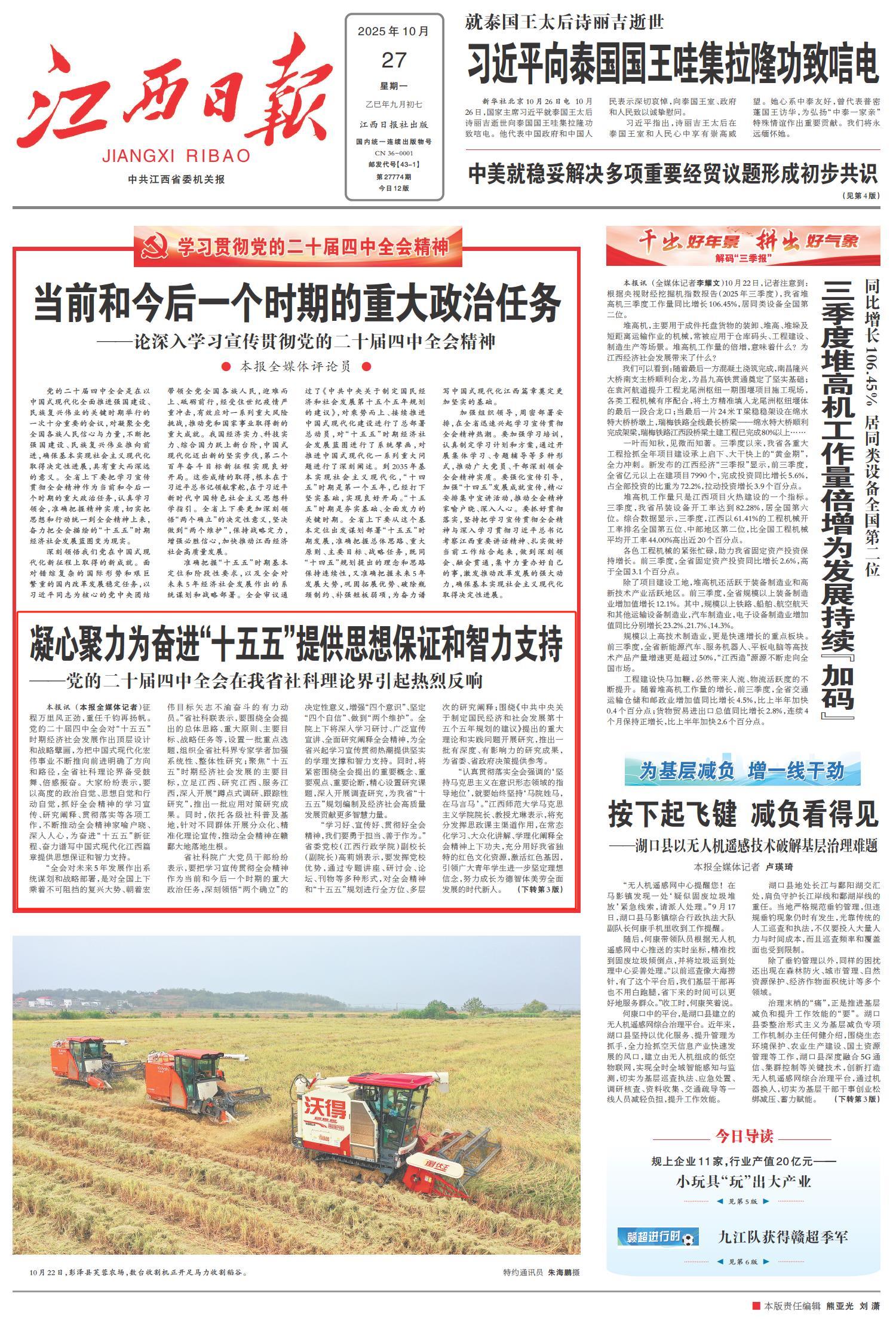 编者按:10月27日,江西日报头版刊登题为《凝心聚力为奋进“十五五”提供思想保证和智力支持》的文章,报道党的二十届四中全会在我省社科理论界引起热烈反响。我校马克思主义学院党委书记雷振文教授在文中发表观点,详情如下: