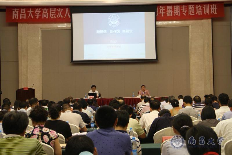 本网讯(记者杨舒苑)8月30日上午,校长周创兵为南昌大学高层次人才、处级干部能力提升暑期专题培训班学员作题为《新机遇、新作为、新篇章》辅导报告,就部省合建的内涵、意义、地位、时代背景、面临机遇与挑战、现实任务等方面进行了分析阐释,并提出了学校的工作思路,部署了新学期工作。校党委书记喻晓社主持报告会。