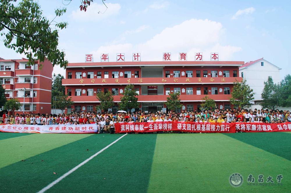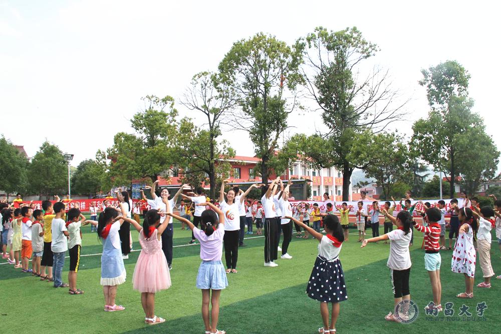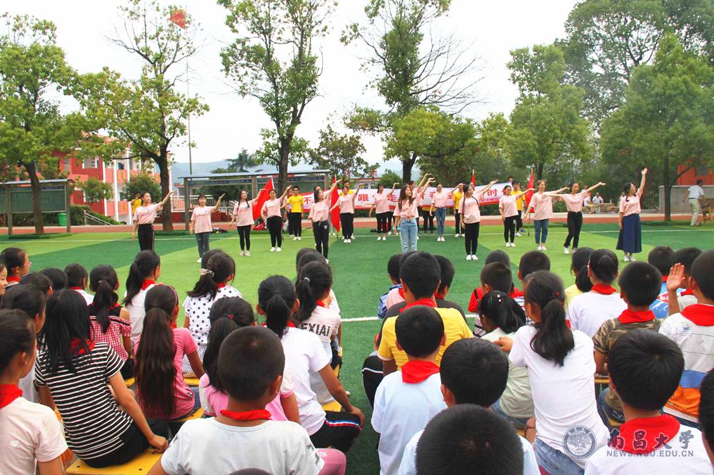 在看望老阿姨的学生队伍中,有一群学生特别激动,他们就是南昌大学经济管理学院国际商务173班的29名学生,他们的班导,正是龚全珍老阿姨的女儿甘公荣。下午,龚全珍研究生支教团的志愿者们和甘公荣的学生们来到了老阿姨工作、生活了几十年的莲花县南陂中小学。他们和一百多名孩子们一起朗诵《可爱的中国》,教唱红色歌曲《闪闪红星》,教手语舞蹈《毛委员和我们在一起》、手语表演《国家》、表演红色家书诵读《又见杜鹃花开》。最后,郑璐老师再次给孩子们演唱了《祖昌,我对你讲》。