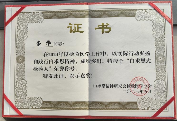 “白求恩式检验人”由白求恩精神研究会、白求恩精神研究会检验医学分会联合评审产生,旨在全面弘扬“毫不利己、专门利人、无私奉献,对工作极端热忱、精益求精”的白求恩精神,表彰在“白求恩式检验科、白求恩式检验人”等寻访活动中涌现的先进个人。此次全国共15人荣获“白求恩式检验人”荣誉称号,李华是2023年度江西省唯一获此殊荣的检验人。