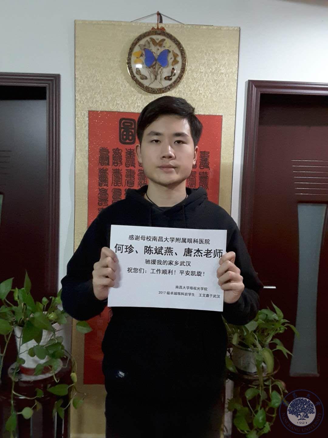 本网讯(附属眼科医院)一次未曾谋面的看望,一杯良药苦口的慰问,这是眼视光学院卓越眼科171班王艾嘉同学在武汉同济医院和南昌大学附属眼科医院之间牵起的赣鄂战友情。