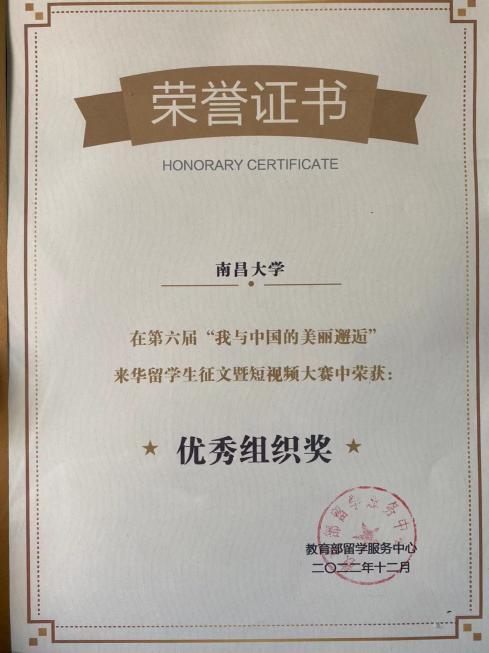 本网讯(跨境教育中心)近日,由教育部国际合作与交流司主办,教育部留学服务中心承办的第六届来华留学生征文暨短视频大赛结果揭晓。我校留学生荣获本届征文大赛2项优秀奖、2项特色奖,2名老师获优秀指导教师奖,南昌大学荣获优秀组织奖。