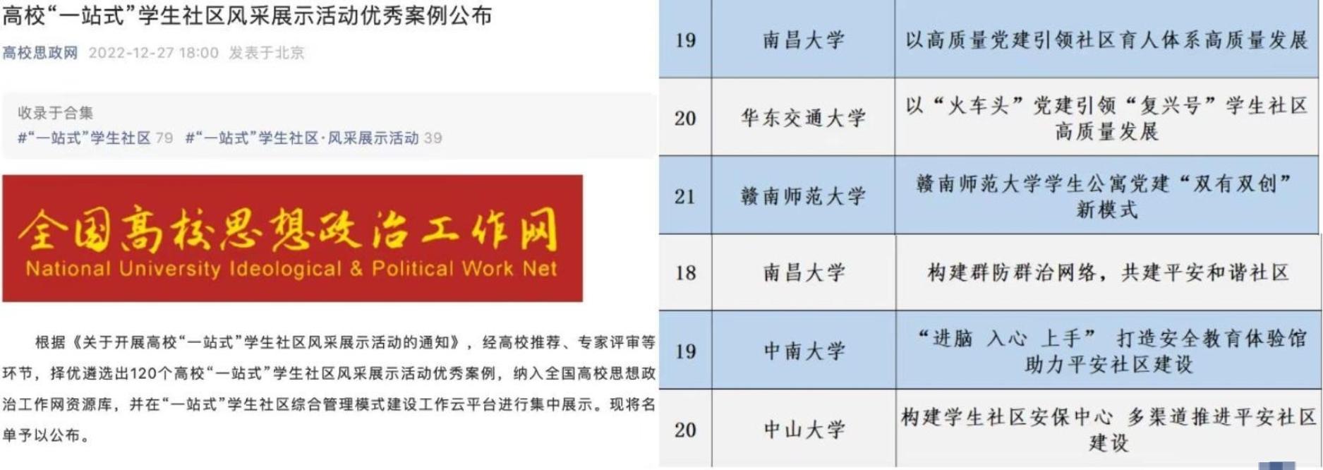 本网讯(学生工作处 张楠熙)近日,全国高校“一站式”学生社区风采展示活动优秀案例名单公布,我校申报的《以高质量党建引领社区育人体系高质量发展》《构建群防群治网络,共建平安和谐社区》2个案例获评为优秀案例。