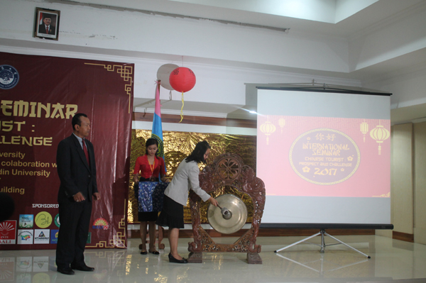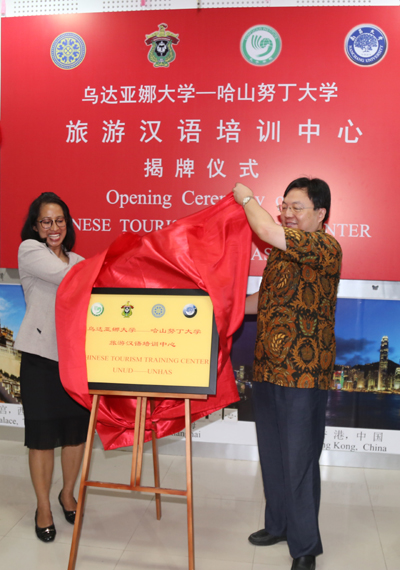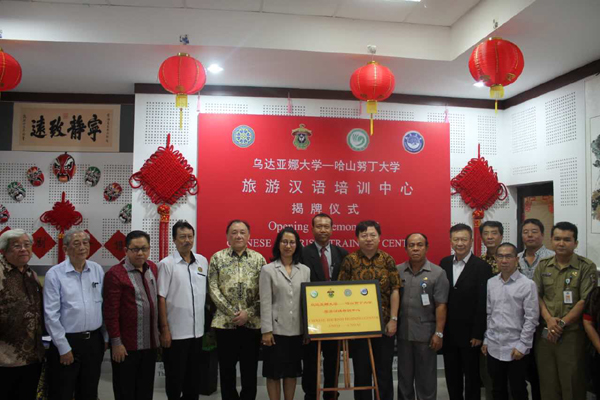 本网讯(国际事务部)10月23日上午,我校承办的印尼哈山努丁大学孔子学院与巴厘岛乌达雅娜大学、哈山努丁大学合作创办的印尼首个“旅游汉语培训中心”举行揭牌仪式。