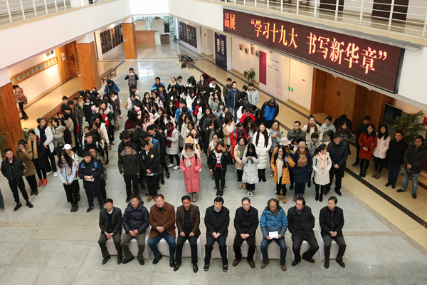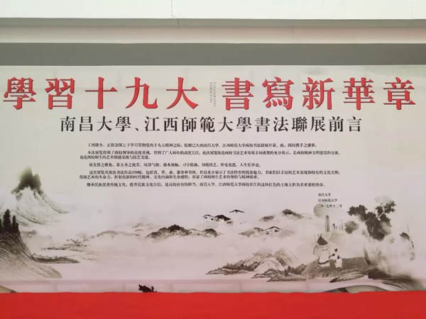 本网讯(学生记者曾宜奇)12月20日上午,南昌大学与江西师范大学共同举办的“学习十九大,书写新华章”师生书法作品联展在我校艺术与设计学院启动。校党委书记胡永新、组织部部长舒明出席开幕式。