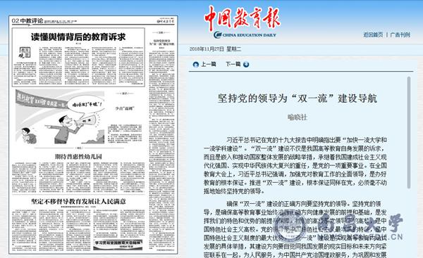 11月27日,《中国教育报》刊发校党委书记喻晓社同志署名文章《坚持党的领导为“双一流”建设导航》,现将全文转发如下: